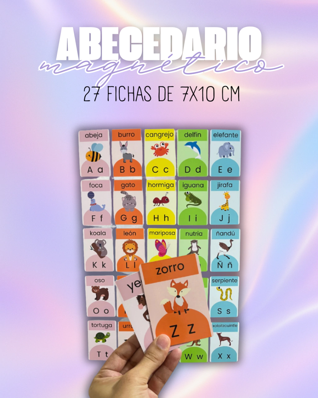 📌 27 fichas magnéticas de 7x10 cm, cada una con una letra y su respectivo animal.